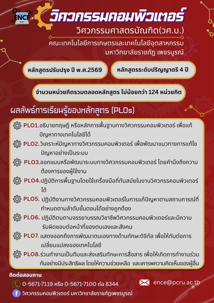 สาขาวิชาวิศวกรรมคอมพิวเตอร์ ศึกษาข้อมูลรายละเอียด หลักสูตรปรับปรุง พ.ศ. 2564 (click หรือสแกน QR Code) ศึกษาข้อมูลรายละเอียด หลักสูตรปรับปรุง พ.ศ. 2569 (click หรือสแกน QR Code) อาจารย์ประจำสาขาวิชาวิศวกรรมคอมพิวเตอร์ ผู้ช่วยศาสตราจารย์ปริยากร บัวทอง ประธานหลักสูตร งานวิจัย Facebook ผู้ช่วยศาสตราจารย์ ว่าที่ ร.ต.วรชัย ศรีสมุดคำ อาจารย์ประจำหลักสูตร งานวิจัย Facebook อาจารย์สมคิด ฤทธิ์เนติกุล อาจารย์ประจำหลักสูตร งานวิจัย Facebook อาจารย์ยศวรรธน์ จันทนา อาจารย์ประจำหลักสูตร งานวิจัย Facebook ผู้ช่วยศาสตราจารย์วาสนา วงศ์ษา อาจารย์ประจำหลักสูตร งานวิจัย Facebook FacebookFacebookXXLINELine